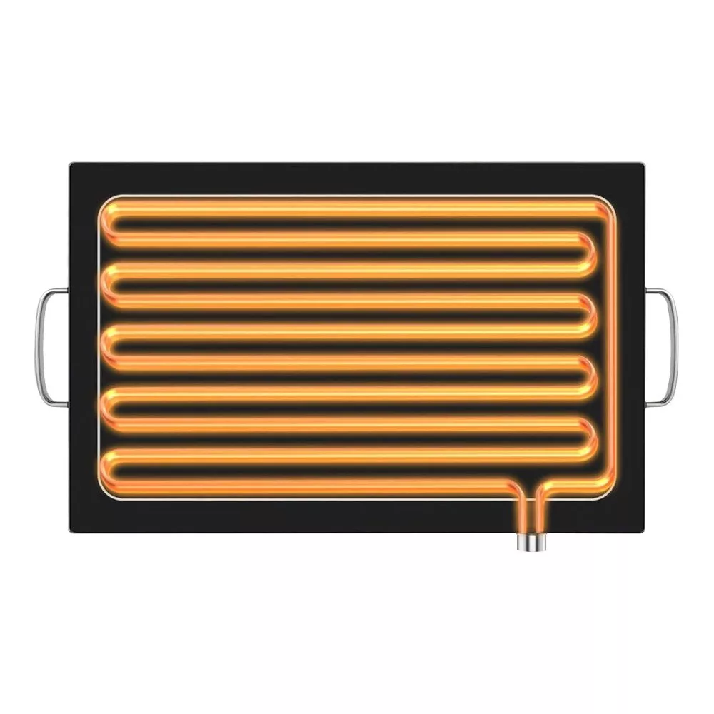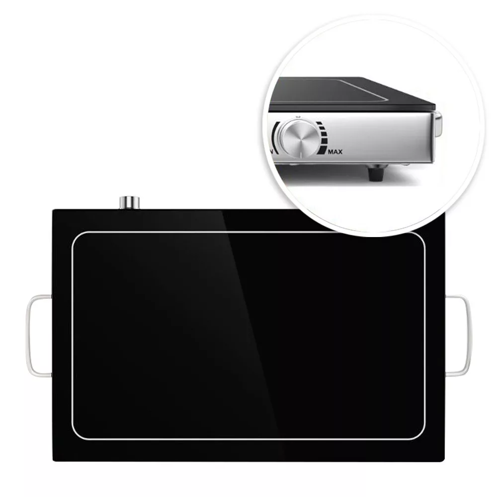 A rozsdamentes acél ház és az edzett üvegfelület egyszerűen letörölhető. A hűvösen maradó fogantyúk biztonságos mozgatást tesznek lehetővé, a csúszásgátló lábak pedig stabilitást biztosítanak, miközben megóvják az asztalt a karcolásoktól. Kompakt, 6,5 cm vastagságú kialakítása révén könnyen tárolható akár szekrényben vagy polcon is.