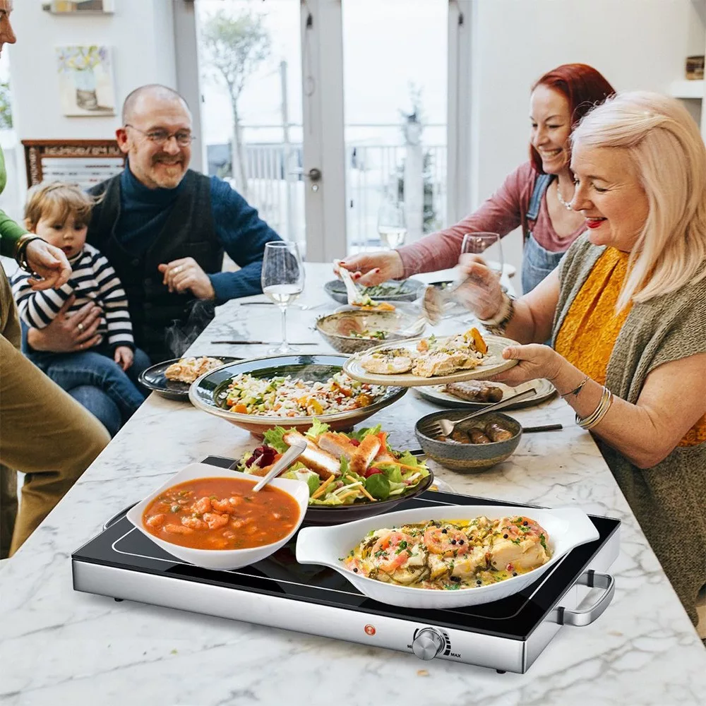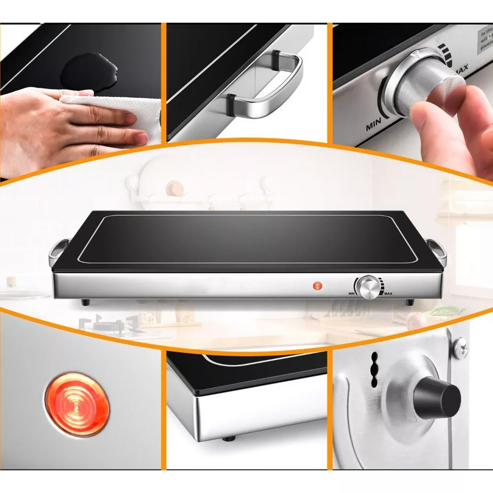 A 56 × 36 cm-es felületnek köszönhetően egyszerre több edény vagy tányér is elfér rajta, így többféle étel – például főfogás, köret vagy tea – is melegen tartható. Hasznos eszköz otthonra, családi alkalmakra, kisebb rendezvényekre.