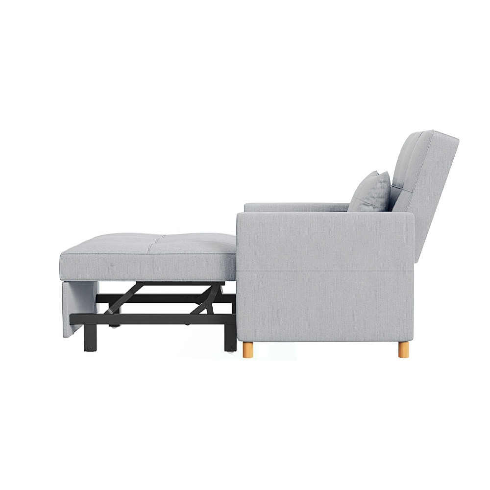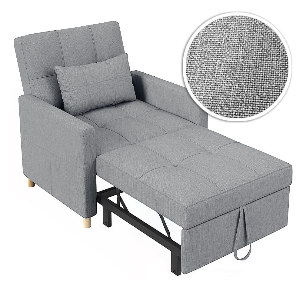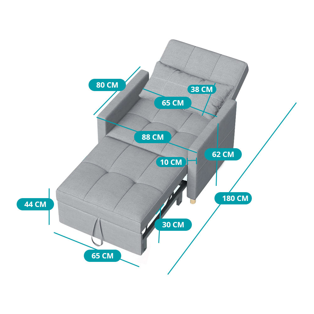 Összecsukva klasszikus fotelként használható, kihúzva pedig tágas fekvőfelületet kínál. A karfák 80 cm hosszúak és 10 cm szélesek, így kényelmes támaszt nyújtanak. Az egyszerű kihúzó mechanizmusnak köszönhetően pillanatok alatt átalakítható.