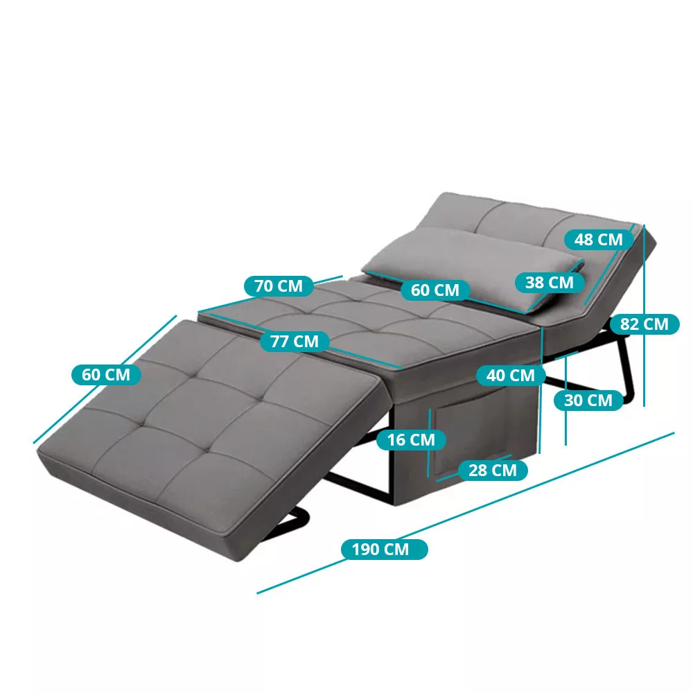 Összecsukva kompakt fotelként használható (77×70×40 cm), kinyitva pedig 80×190 cm-es fekvőfelületet kínál. A praktikus oldalzsebben újságot, távirányítót vagy telefont is tárolhatsz.
