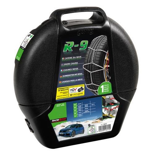 Gyors felszerelésű 9 mm-es hólánc gyémánt mintázattal , kifejezetten olyan autókhoz ahol a kerék és a futómű tartozékai között kicsi a hely.