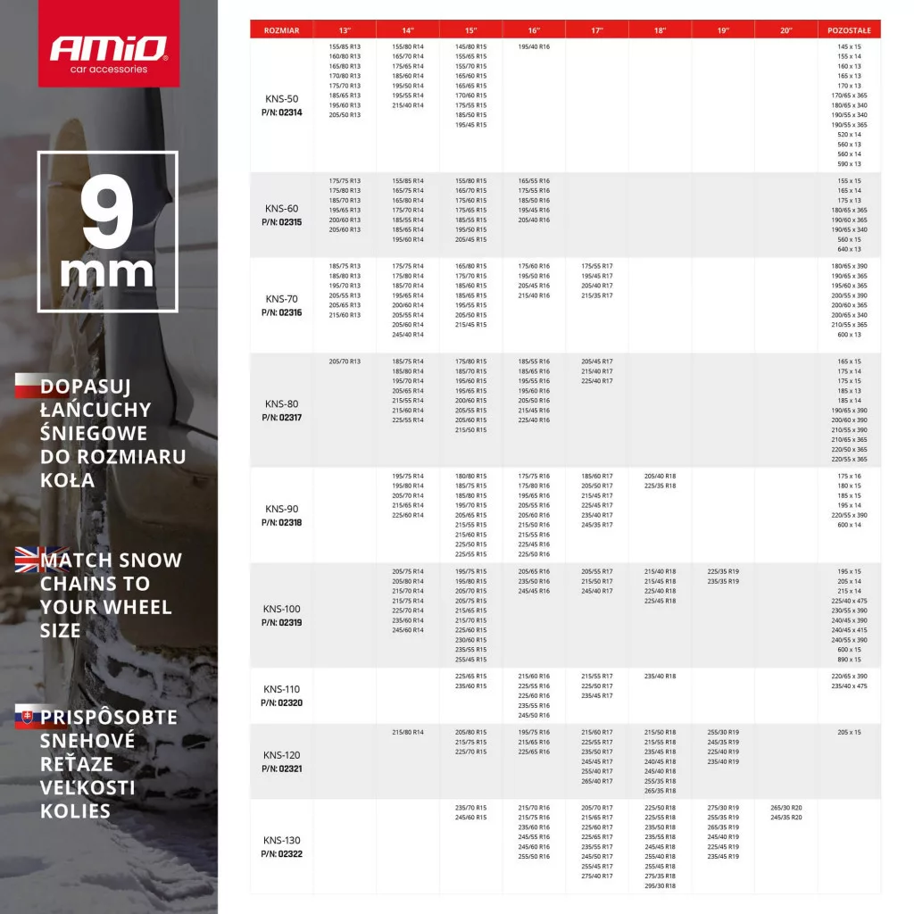 Edzett acélból készült hólánc aszimmetrikus, rombusz alakú láncmintázattal, amely javítja a tapadást havas és jeges útfelületen, és csökkenti a megcsúszás esélyét, különösen kanyarodáskor. A lánc erős, 9 mm magas, négyzet keresztmetszetű láncszemekből áll.