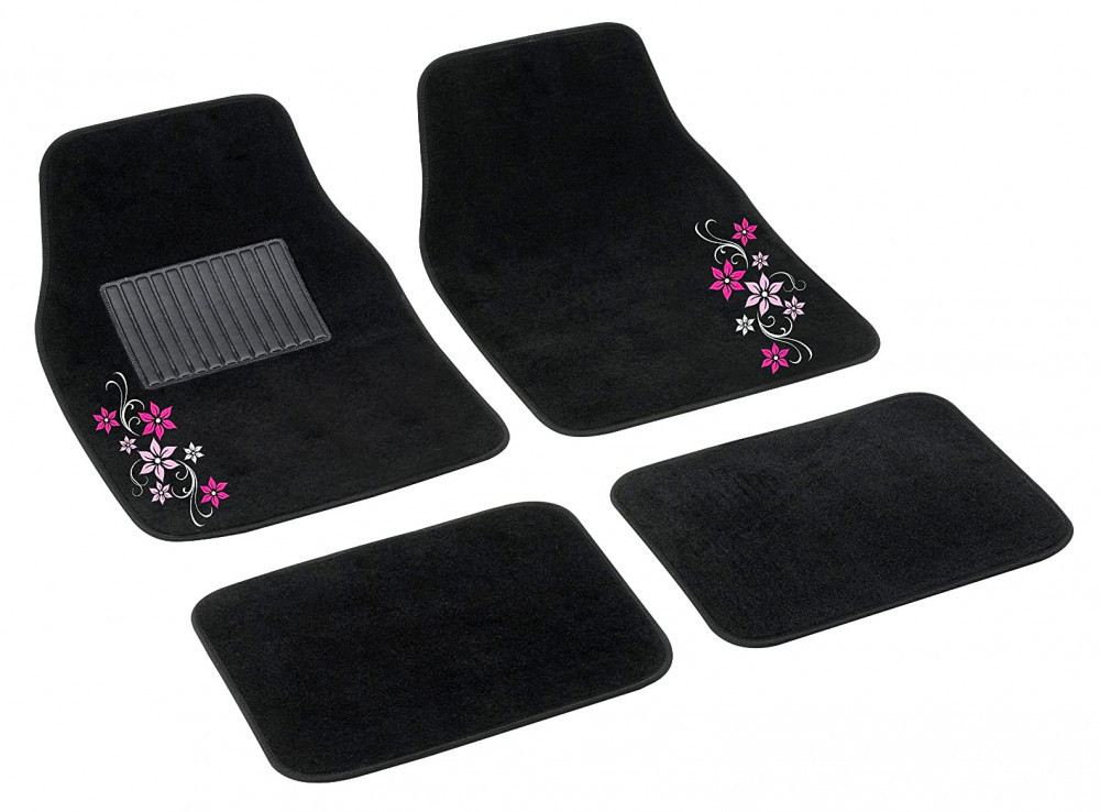 Univerzális, 4 részes Bottari "MyStar" autós szőnyeg garnitúra - fekete, szélén pink virágmintás szett