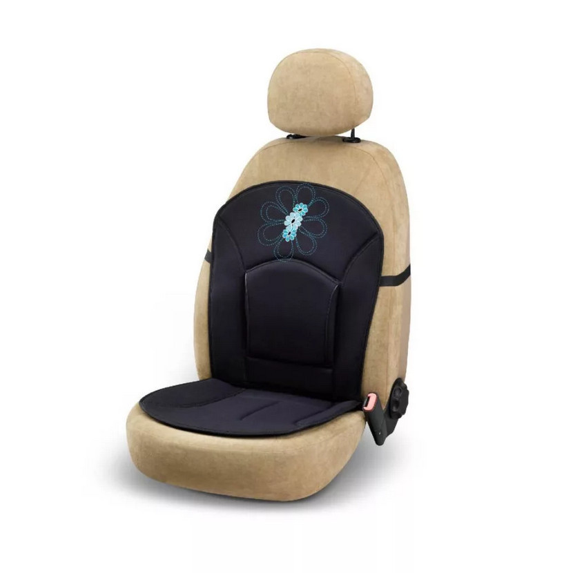 Univerzális ülésvédő fekete színben, kék virág mintával.