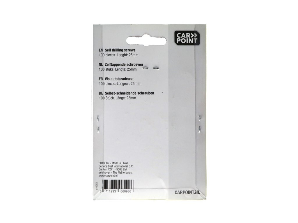 Carpoint önfúró rögzítőcsavarok hengeres fejjel műanyag panelek és fémlemez rögzítéséhez. A horganyzott, önmetsző csavarok 4 mm átmérőjűek és 25 mm hosszúak, behajtásuk PH2 csillagfejű csavarhúzóval történik. A termék 100 darabos blisztercsomagolásban kapható.