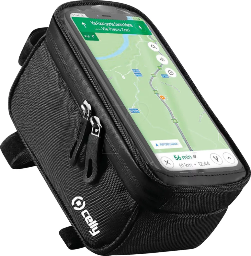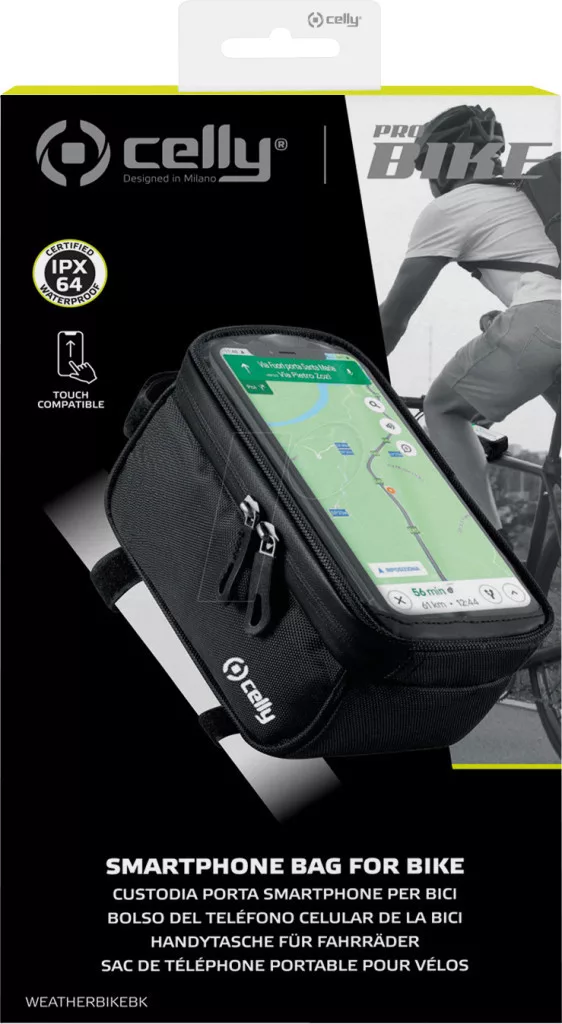 A Celly Weatherbike egy IPX64 tanúsítvánnyal rendelkező okostelefon kerékpáros táska, amely megvédi értékeid az esőtől, útközben vagy sporttevékenység közben. Az átlátszó ablak segítségével okostelefonod érintőképernyőjét (170x85mm-ig) használhatod anélkül, hogy kivennéd a tokból, emellett kompatibilis az arcazonosítóval is. A Weatherbike praktikus külső zsebbel és nagy belső hellyel rendelkezik a kis és közepes méretű tárgyak, például kulcsok, pénztárcák és fülhallgatók tárolására. Könnyen felszerelhető, a vázrögzítés lehetővé teszi, hogy a Weatherbike-ot biztonságosan és szilárdan rögzítse kerékpárjához.