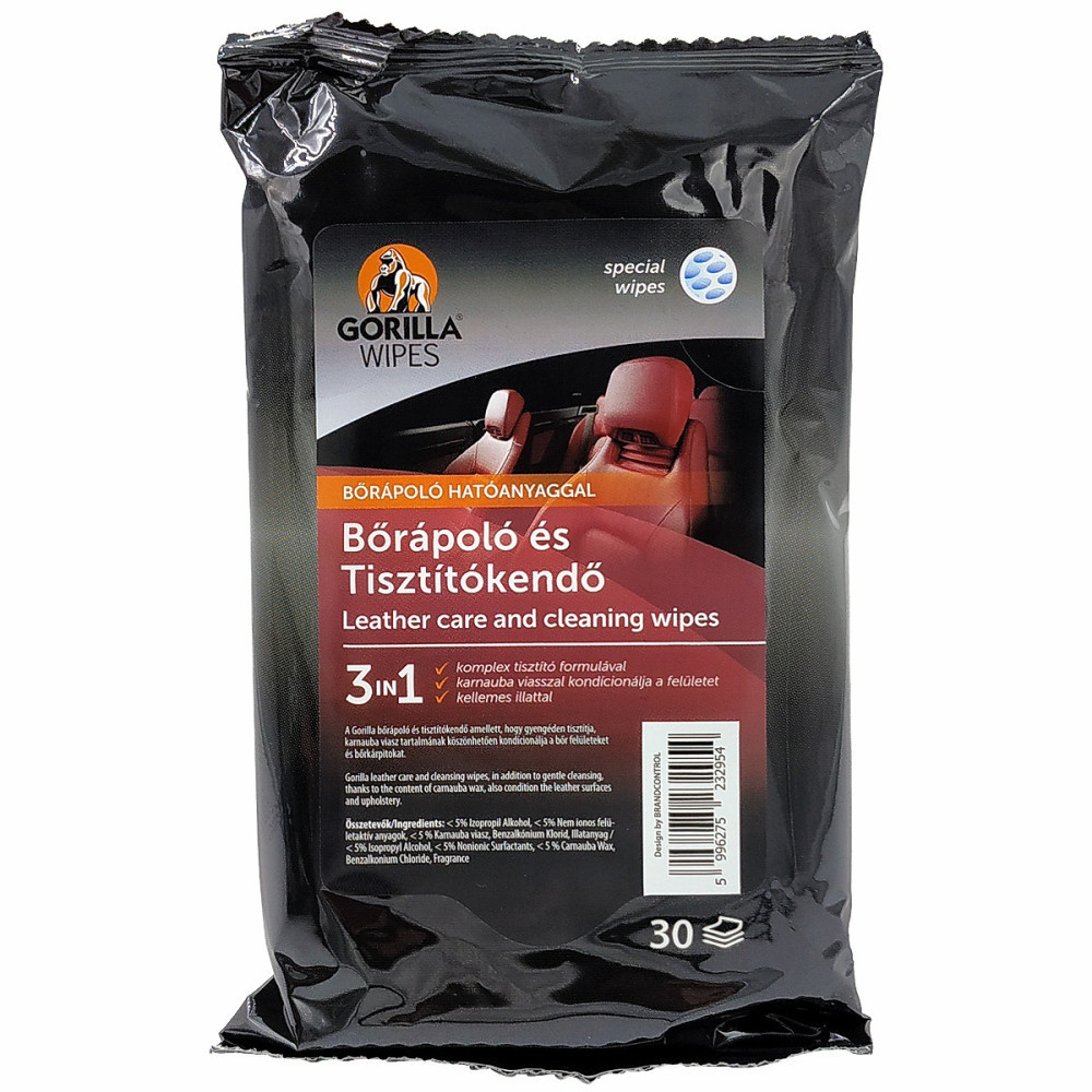 A finom bőr különleges bánásmódot igényel, hogy megtartsa eredeti állapotát. A Gorilla Leather Wipes nedves törlőkendővel könnyedén eltávolíthatja a beivódott szennyeződéseket és a port a bőr és a műanyag felületekről az autójában. A speciális anyagú kendőszövet magába zárja a szennyeződéseket ezáltal tisztítja, puhítja és táplálja. Ragyogóvá teszi autója bőr részeit, meghosszabbítva élettartamát. Használatával hosszú távú védelmet kap a kezelt felület. Csíkmentesen tisztít és ragyogó felületet hagy maga után. A csomagolás formátuma praktikus és helytakarékos, kényelmesen elfér minden kesztyűtartóban vagy az ajtó oldalában.