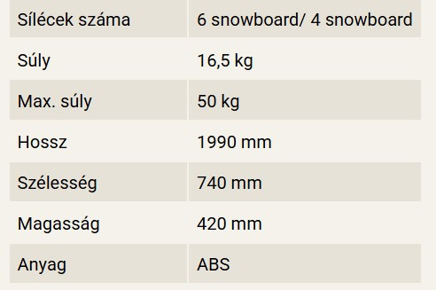 6 pár síléchez vagy 4 snowboardhoz, maximum 185 cm hosszúságig