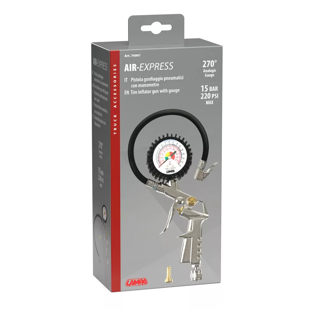 A Lampa légnyomásmérő pisztoly megbízható és precíz eszköz gumiabroncsok nyomásának mérésére, felfújására és leeresztésére. A maximum 15 bar nyomásmérési tartománynak köszönhetően alkalmas személyautók, kisteherautók és motorkerékpárok abroncsainak ellenőrzésére is.