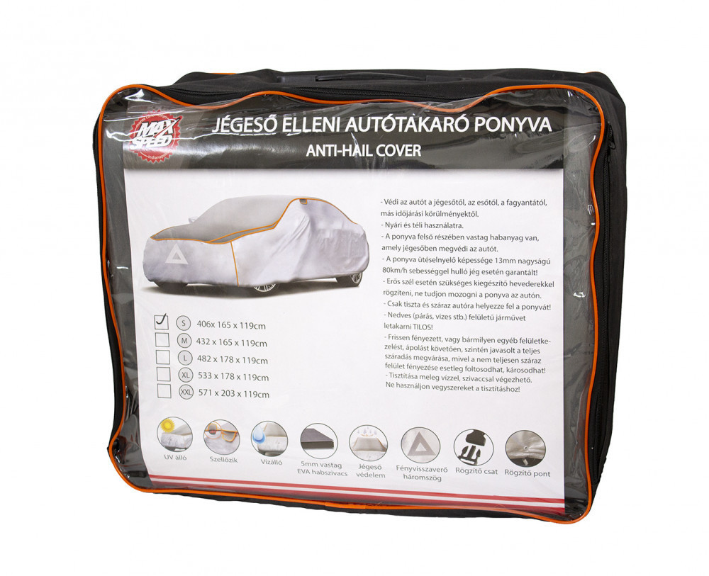 A ponyva felső részében vastag habanyag van, amely jégesőben megvédi az autót.