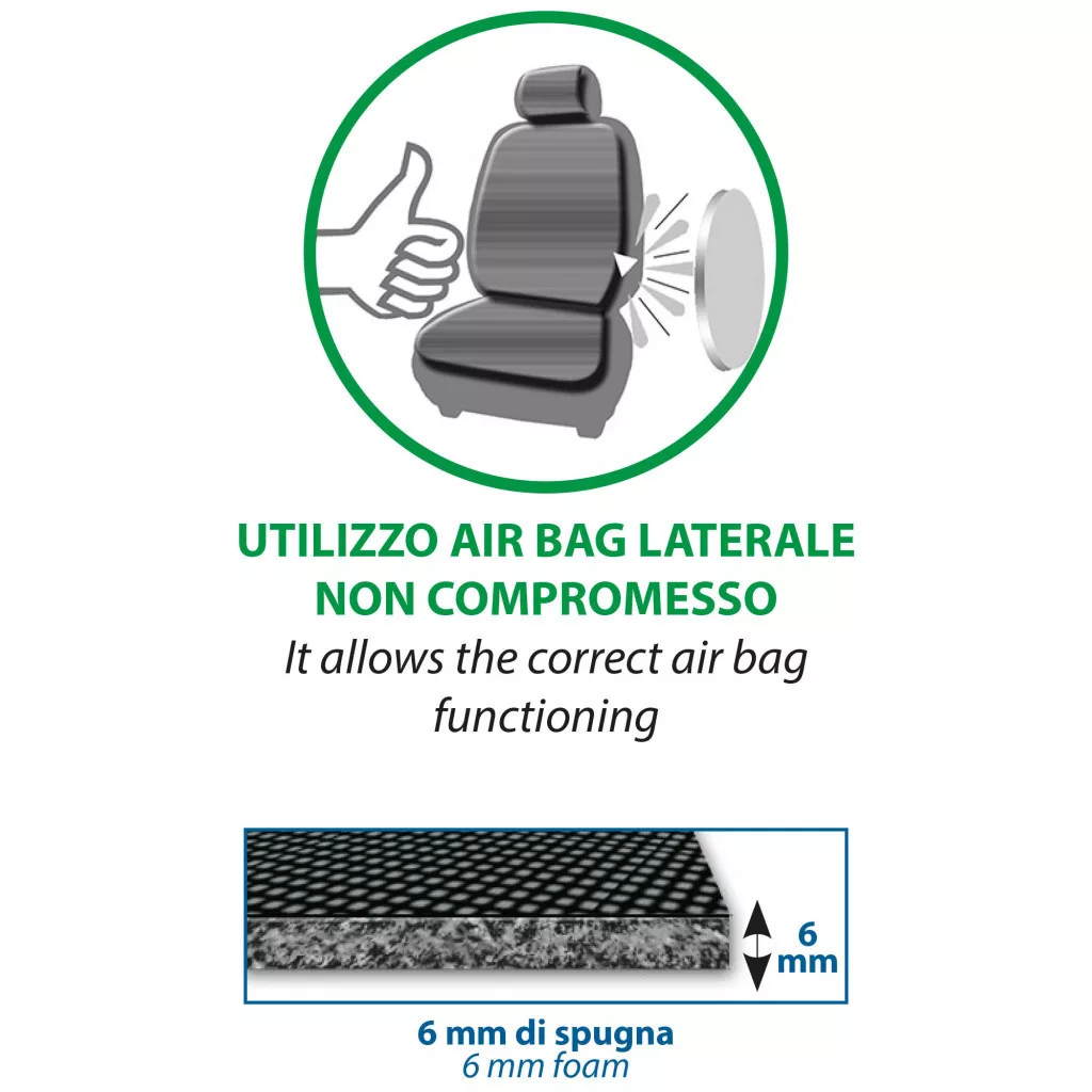 Az oldalsó részek összehangolt láncfonalból készültek (lehetőség van lyukak készítésére biztonsági övnek, fejtámlának és egyebeknek).
