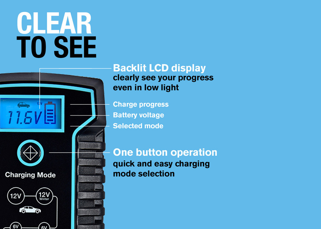 Egygombos működtetés és megvilágított digitális kijelző a könnyű használat érdekében, valamint fordított polaritás és rövidzárlat elleni védelem a biztonság érdekében.