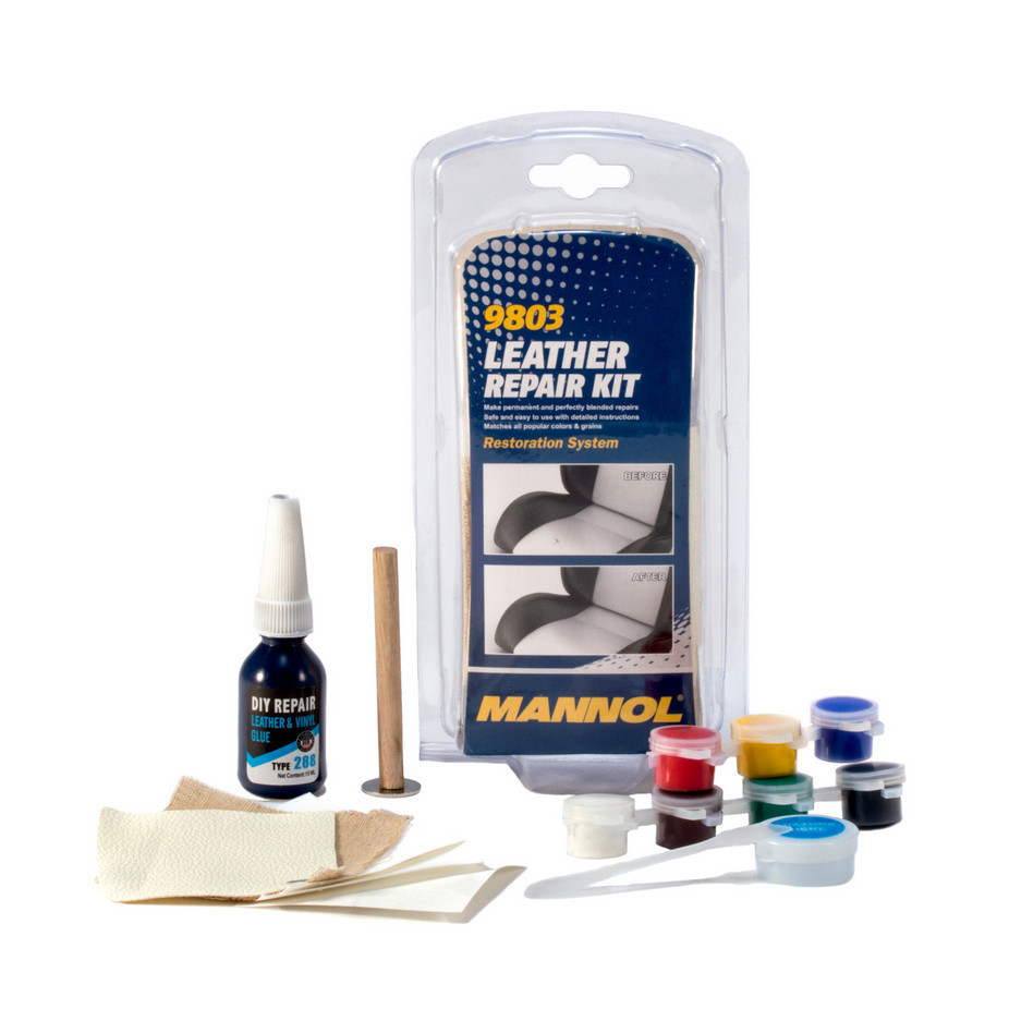 A MANNOL 9803 Leather Repair Kit egy nagyon hasznos és könnyen használható eszköz repedések, vágások, égésnyomok és szakadások javítására bőr ill. műanyag felületeken. A készlet tartozéka a környező anyagokhoz passzoló színek és rostpapírok választéka, melyekkel a javítások könnyebben olvadnak bele a környező műanyagba vagy bőrbe. A mellékelt színskála segít a sérült felületnek leginkább megfelelő szín kiválasztásában.