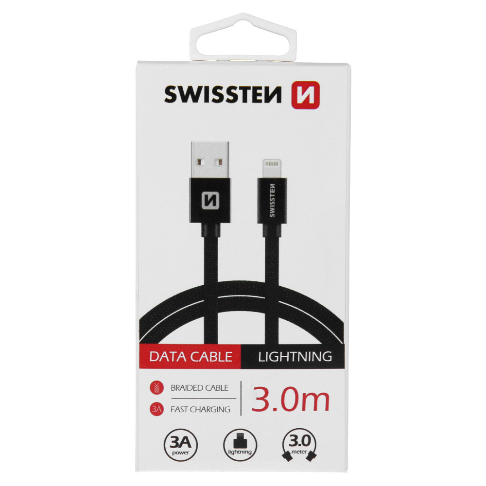 Swissten USB / Lightning adatkábel kiváló minőségű textil fonással. 3,0 m-es hosszának köszönhetően alkalmas teherautókra, családi autókra vagy világutazásra. A kábel megerősített, így több áramot (3A-ig) továbbít, és 480 Mb/s-os gyors adatátvitelt is képes kezelni.