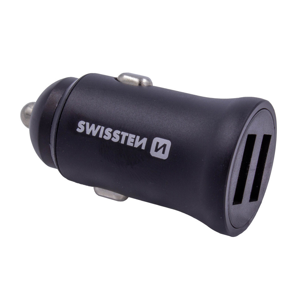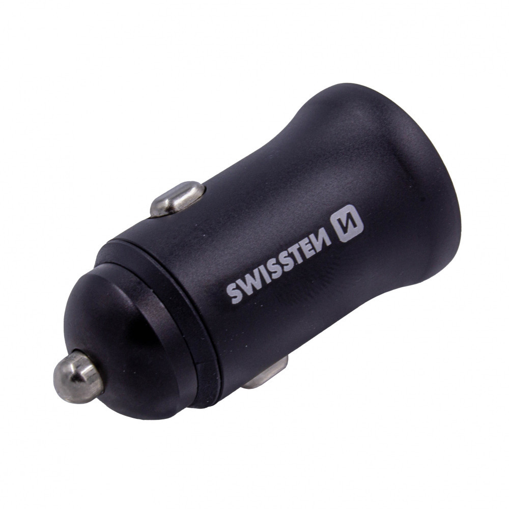 Swissten autós gyorstöltő adapter. Kicsi, könnyű, kompakt és elegáns, metál fekete töltő test.