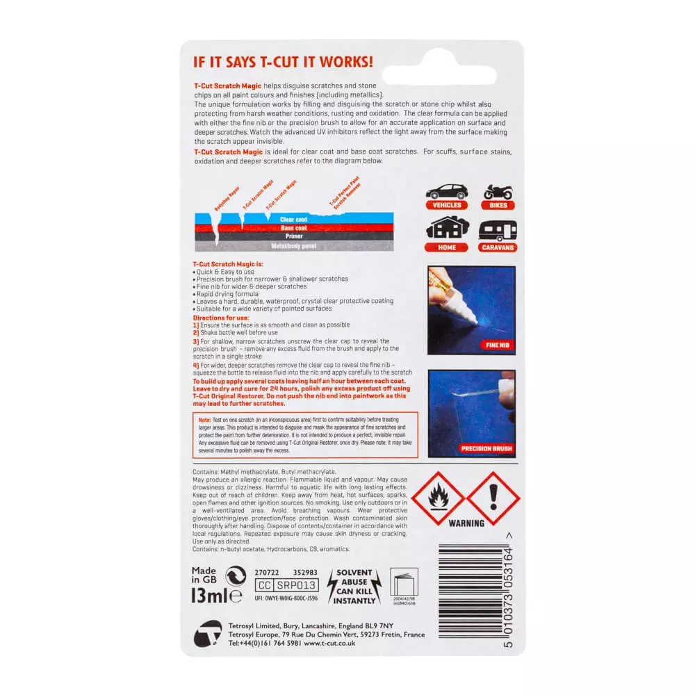 A T-Cut Scratch Magic segít elrejteni a karcolásokat és kőfelverődéseket minden festékszínen és felületen (beleértve a fémeket is). Az egyedülálló összetétel úgy működik, hogy kitölti és elfedi a karcolásokat, miközben véd a zord időjárási viszonyoktól, a rozsdásodástól és az oxidációtól. Az áttetsző formula finom heggyel vagy precíziós ecsettel is felvihető, így lehetővé válik a pontos felvitel a felületre és a mélyebb karcolásokra.