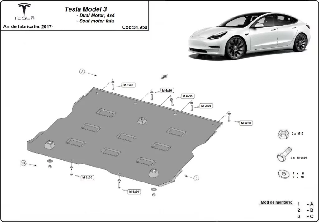 Tesla Model 3 AWD, 2017-2024 - első Acél Motorvédő lemez