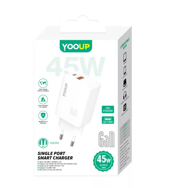 Kimeneti teljesítmény: Maximum 45W – biztosítja az eszközök gyors töltését, ideális többféle készülék számára.